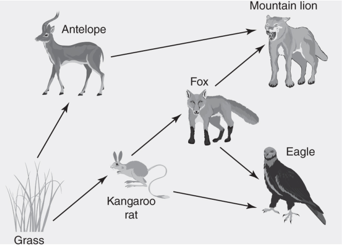 (A) Kangaroo rats eat grass. If the kangaroo rat population was eliminated, less grass would be consumed, and the biomass of the producers (the grass) would most likely increase. The foxes feed on the kangaroo rats, so the elimination of the kangaroo rats would result in less food for the foxes. In that case, the number of foxes would likely decrease, not increase, so choice (B) is incorrect. Choice (C) is incorrect because fewer kangaroo rats would mean more grass for the antelopes, not less. Mountain lions do not eat eagles in this food web, so choice (D) is incorrect.