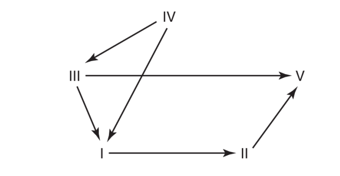Q10. Refer to the following food web. The arrows show the direction of the flow of energy, and species are represented by Roman numerals.