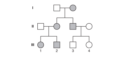(A) This is most likely a mitochondrial trait (see the explanation for Question 9). Individual III-3 does not have the trait, so he does not carry the allele. Even if he did carry the allele, males cannot pass on mitochondrial traits to the next generation. If he has a child with a woman who also does not have the allele, there is 0% chance of them having a child with the trait since neither of them have the allele for the trait. Choices (B), (C), and (D) are incorrect because if the woman does not have the allele for a mitochondrial trait, her offspring will not have the allele for the trait.