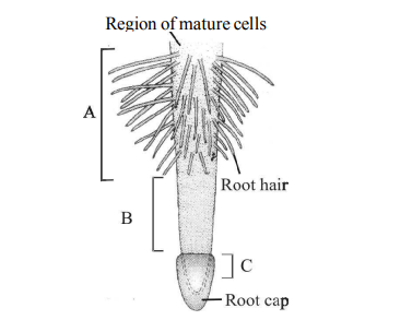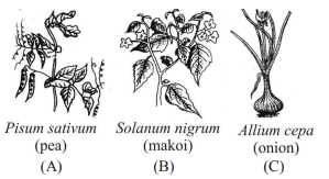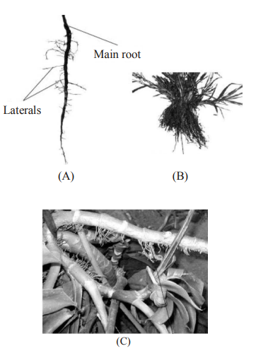 Q141. The given figure (A, B, and C) shows different types of roots. Identify the root which is seen in wheat plant.