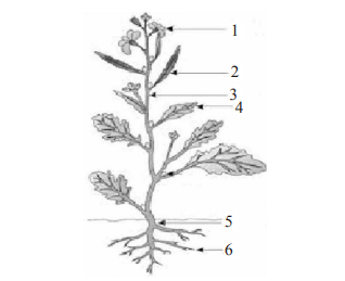 The root system (represented by 5 and 6) is responsible for anchorage, absorption of water/minerals, storage of food, and synthesis of plant growth regulators.