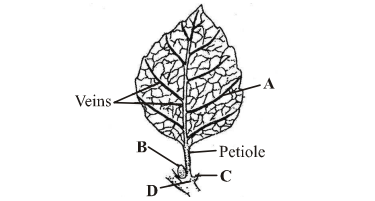 Q14. Which of the following option shows the correct labelling of the parts of leaf marked as A, B, C and D.