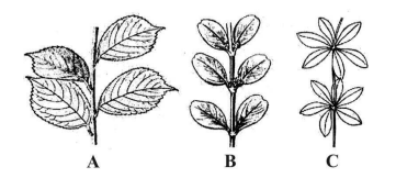 A shows one leaf per node (alternate). B shows two leaves per node (opposite). C shows more than two leaves per node (whorled).