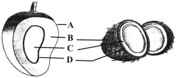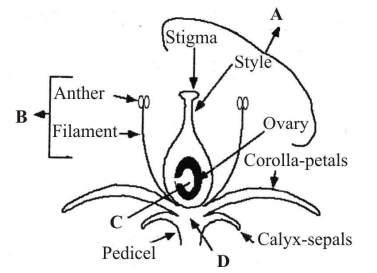 A is the female part (Gynoecium), B is the male part (Stamen), C is the ovule inside the ovary, and D is the base (Thalamus).