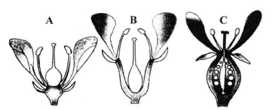 Q126. Identify the kind of phyllotaxy shown in the given figures A, B, and C.