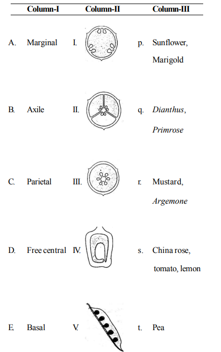 Marginal: V (Pea, t); Axile: II (China rose/Tomato/Lemon, s); Parietal: I (Mustard/Argemone, r); Free central: III (Dianthus/Primrose, q); Basal: IV (Sunflower/Marigold, p).