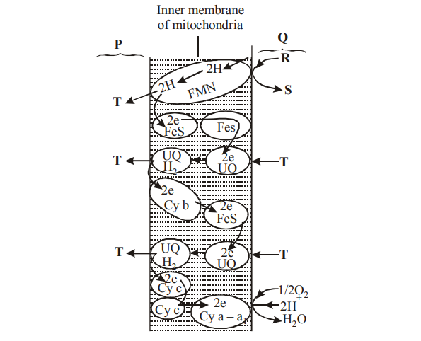 Q43. In the given figure of electron transport chain - identify P, Q, R, S and T.