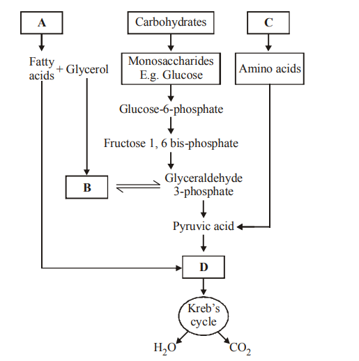 Q13. The given figure represents the interelationship among metabolic pathways showing the respiration mediated breakdown of different organic molecules to CO2 and H2O. Now identify A to D.