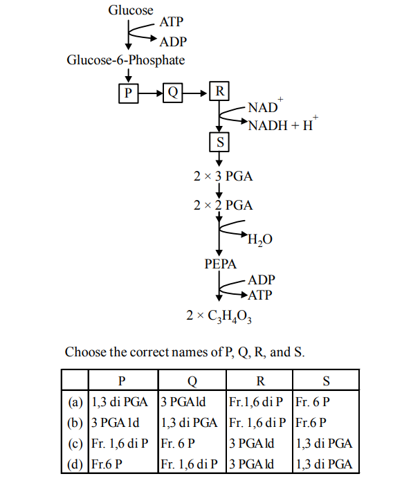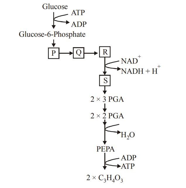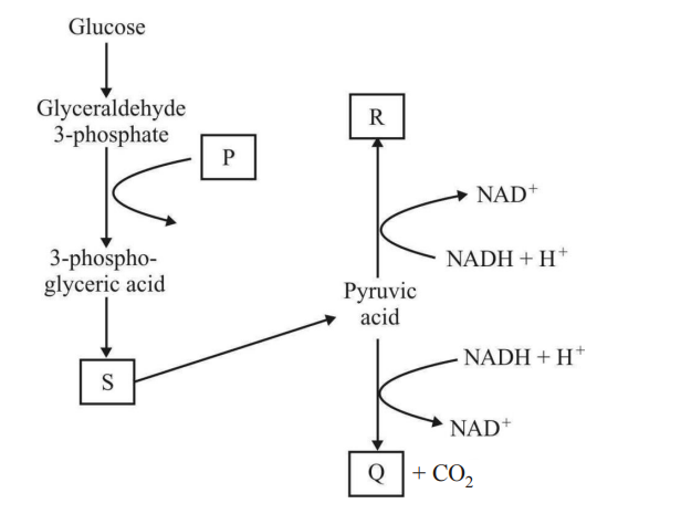 Q44. The given figure shows the few major steps of the pathway of anaerobic respiration as indicated by P, Q, R and S. Identify P, Q, R and S.