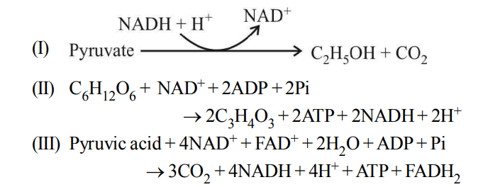 Eq I: Ethanol production (Fermentation). Eq II: Glucose to pyruvate (Glycolysis). Eq III: Pyruvate oxidation (Krebs cycle).