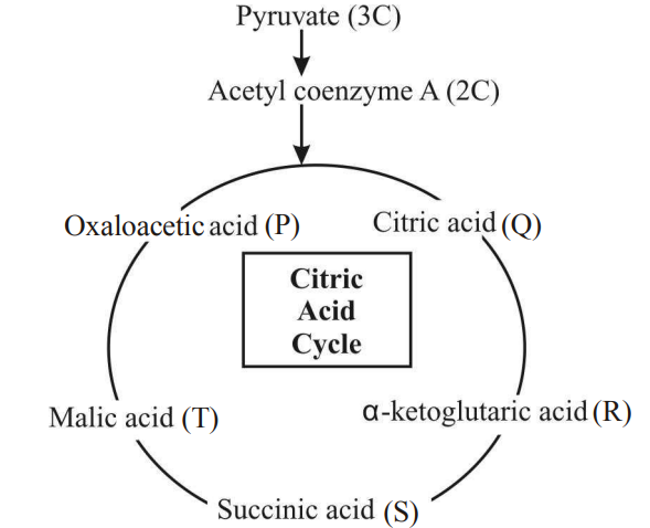 Q5. Refer the figure of citric acid cycle and choose the correct combination of labelling (P, Q, R, S and T) indicating the number of carbon compounds in the substrate molecules, involved in the given figure.
