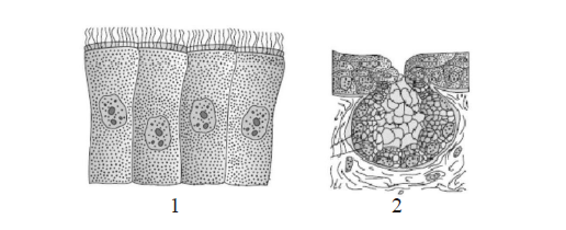 Figure 1 shows tall columnar cells with cilia (ciliated epithelium). Figure 2 shows a cluster of secretory cells forming a multicellular gland.