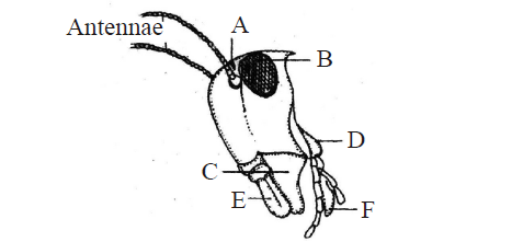 Q24. The figure given below shows the head region of cockroach. Identify A to F.