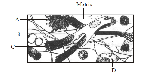 Q35. In the given diagram of areolar connective tissue, the different cells and parts have been marked by alphabets (A, B, C & D). Choose the answer in which these alphabets correctly match with the parts and cells they indicate.