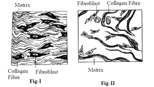 Figure I shows collagen fibers arranged in parallel (dense regular), while Figure II shows fibers arranged randomly (dense irregular).