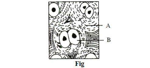 Q124. The intercellular material of the given figure is solid and resists compression. Identify the figure and the label marked as A & B.