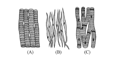 In the diagrams: A shows striated, unbranched fibers (skeletal); B shows spindle-shaped fibers (smooth); C shows striated, branched fibers (cardiac).
