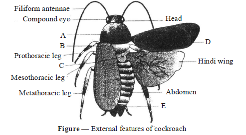 Q90. The following figure shows the extarnal features of cockroach with few structures labelled as A, B, C, D, and E. Identify A to E .