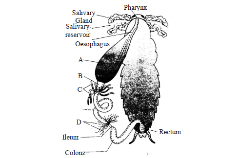 Q121. The given figure shows the digestive system of cockroach with few structures marked as A, B, C and D. Identify structures A to D.