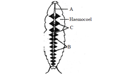 Q18. The given figure shows open circulatory system of cockroach with structure marked as A, B and C. Which structure is a 13 pair of wing shaped involuntary muscles and mantain blood circulation?