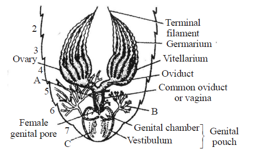 Q98. Figure given below shows reproductive system of female cockroach. The correct labellings indicated by alphabets (A, B & C) are respectively
