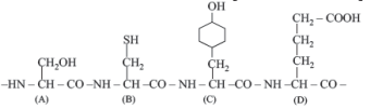 Q81. The figure shows a hypothetical tetrapeptide portion of a protein with parts labeled A-D. Which one of the following option is correct? [NEET Kar. 2013]