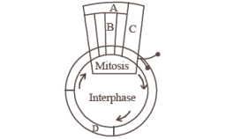 In the diagram, A is Mitosis (M phase), specifically Karyokinesis? No, A is usually M phase. Interphase consists of G1, S, G2. D represents S phase (Synthetic phase) which comes after G1 (C) and before G2 (E). Wait, diagram usually goes G1->S->G2->M. If D is S-phase, then C is G1, E is G2. B is part of M phase. The question asks for correct indication. D - Synthetic phase is correct.